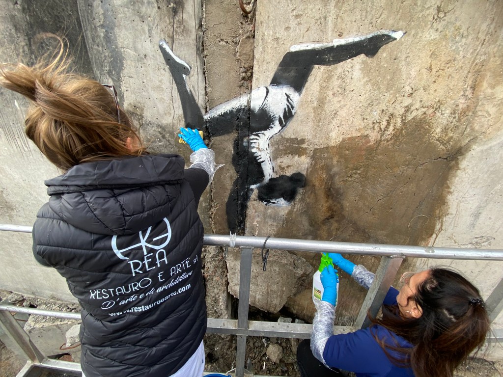 We did the restoration in wartime, in four different stages driving from Italy and offering our service for free, to give our support “our way”. Our experience on this kind of artworks comes from other 4 pieces of Banksy we have restored in England before.